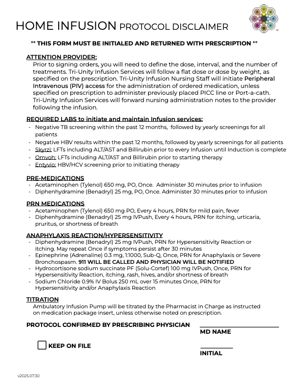 Order FormsClick on the forms to download a fillable PDF, or fill out our Online Intake Form. Crohn’s Disease / Ulcerative Colitis Order Form Home Infusion Protocol Disclaimer Pediatric Crohn’s or Ulcerative Colitis Order Pediatric Home Infusion Protocol Disclaimer Rheumatology Order Form