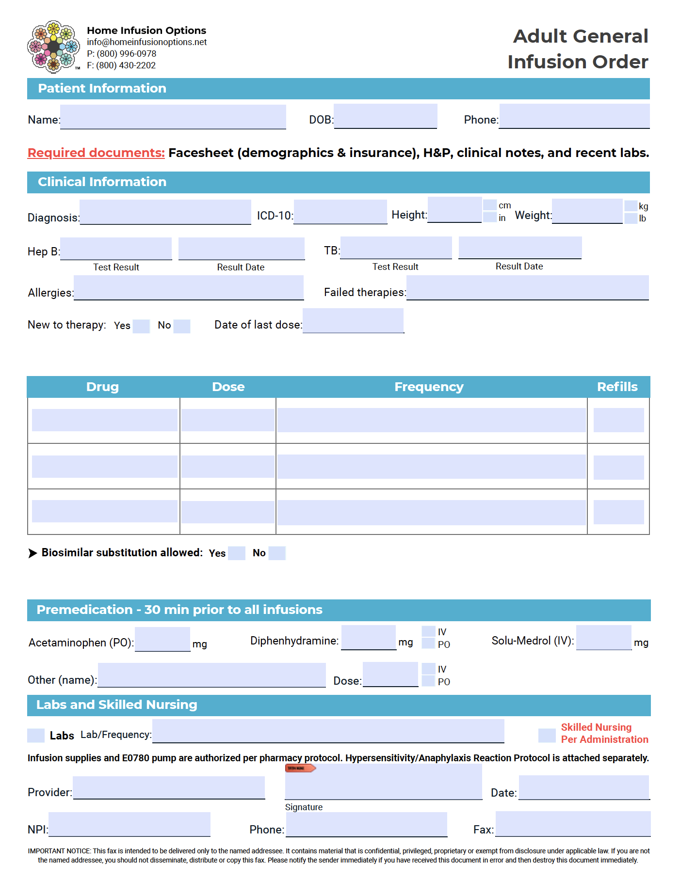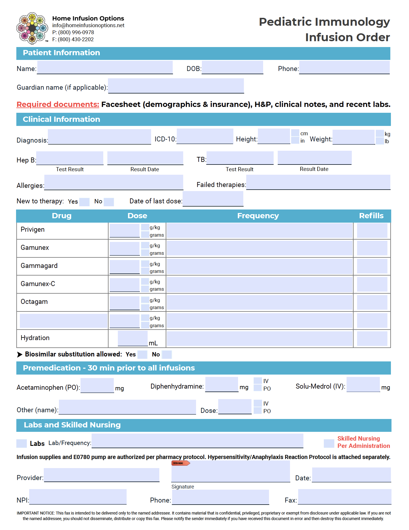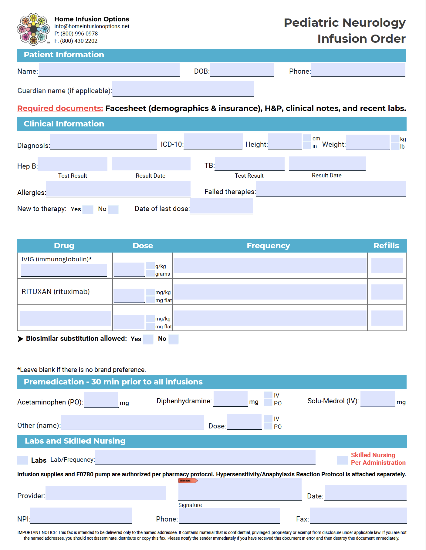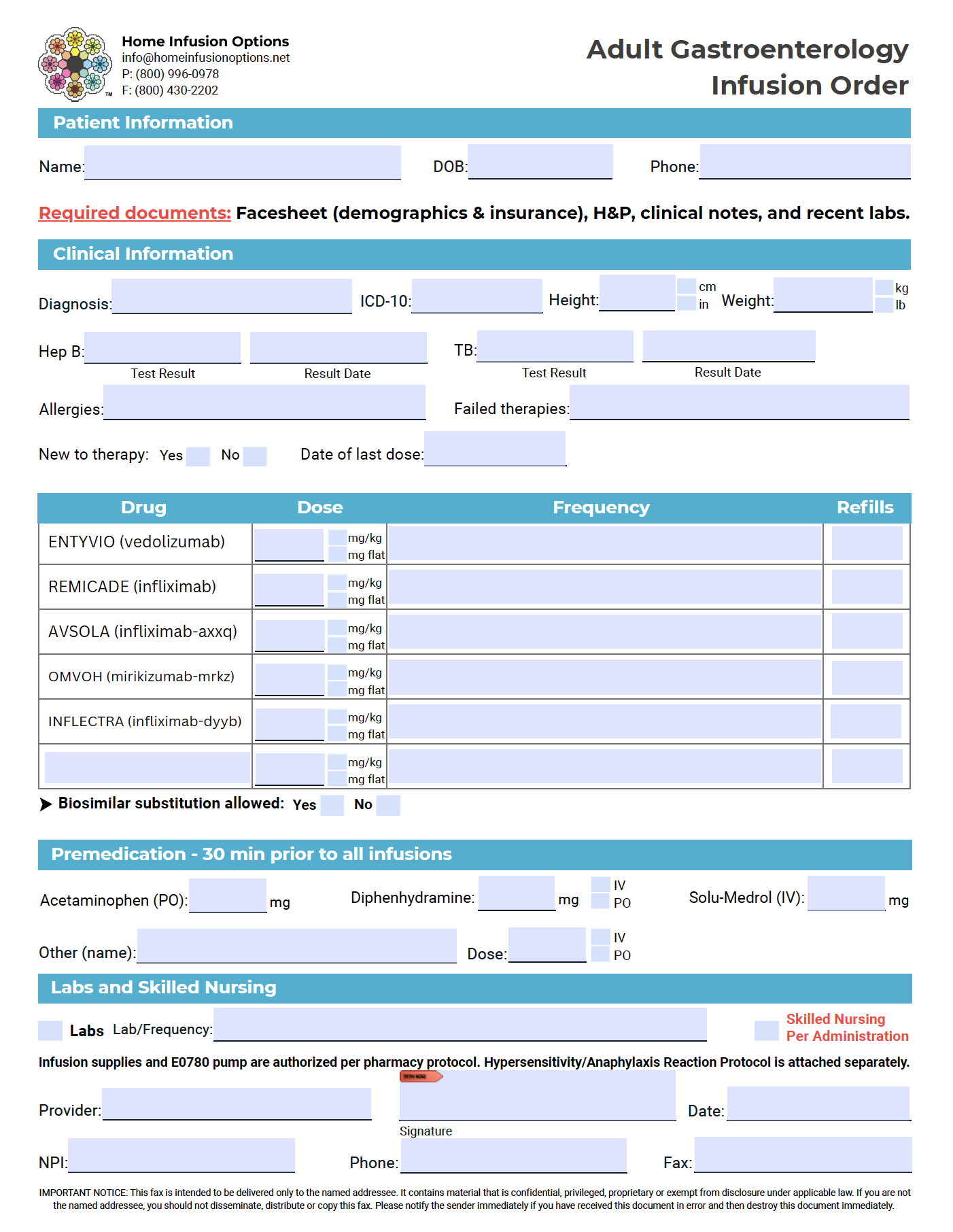 Order FormsClick on the forms to download a fillable PDF, or fill out our Online Intake Form. Pediatric Gastroenterology Pediatric Immunology Pediatric Neurology Adult Gastroenterology Adult Immunology Adult Neurology Infusion Lab Policy Disclaimer Pediatric Protocol Disclaimer Pediatric Rheumatology Pediatric Dermatology Pediatric General Form Adult Protocol Disclaimer Adult Rheumatology Adult Dermatology Adult General Form